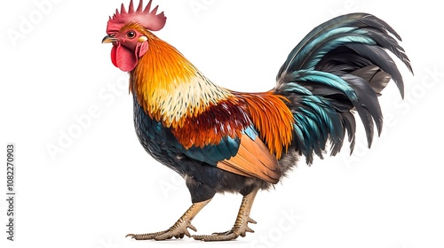 A colorful rooster with a red comb and wattles stands on a white background, looking to the left.
