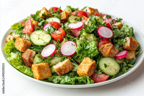 A colorful salad featuring greens, tomatoes, cucumbers, radishes, and croutons.