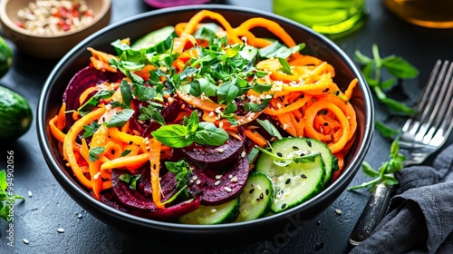 A colorful salad with spiralized carrots, beets, and cucumber, topped with fresh herbs and a light vinaigrette, placed in a sunlit garden setting