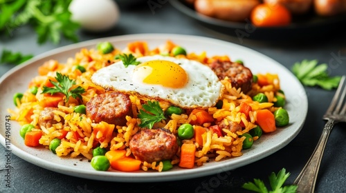 A colorful serving of American fried rice with chunks of sausage, peas, and carrots, garnished with a fried egg and fresh parsley on a white plate