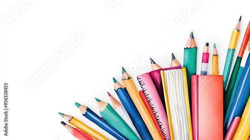 A colorful set of school supplies with books, watercolor illustration, soft tones, isolated on white background