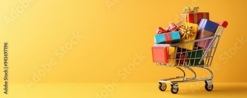 A colorful shopping cart filled with bright gifts against a vibrant yellow background, perfect for holiday and festive themes