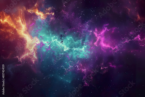 A colorful space scene with a purple and green cloud in the middle