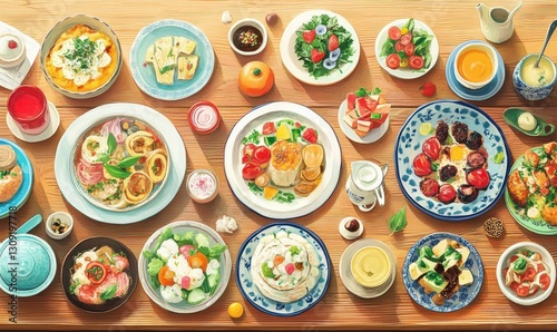 A colorful spread of various dishes displayed on a wooden table.