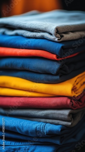A colorful stack of neatly folded clothes showcasing different styles and textures, perfect for fashion and textile themes.