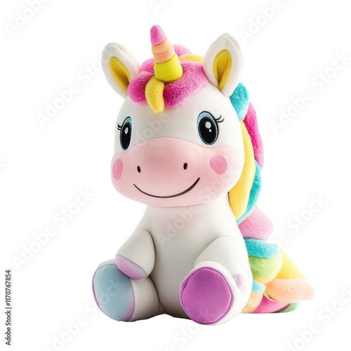 A colorful unicorn plush toy with a friendly smile, featuring a rainbow mane and tail, perfect for cuddling or as a decorative piece.