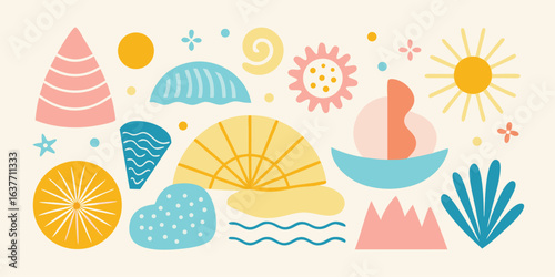 A colorful vector set of Easter eggs, flowers, and a banner with a tropical island illustration