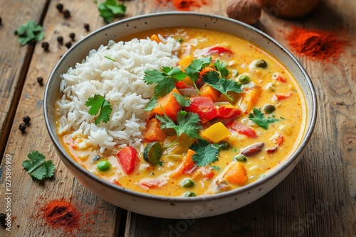 A colorful vegetable curry with white rice in a ceramic bowl, garnished with fresh coriander, served on a rustic wooden table with spices and nuts.