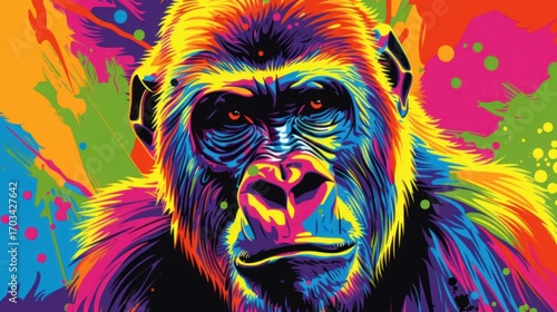 A colorful, vibrant, abstract illustration of a gorilla's face with a rainbow gradient, set against a colorful, splatter-like background.