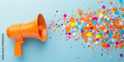 A colorful, vibrant, and festive megaphone with confetti flying out, against a blue background.