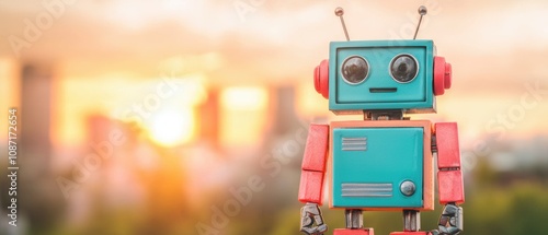 A colorful vintage robot stands against a city skyline at sunset, showcasing the blend of technology and nostalgia.