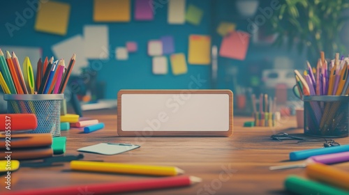 A colorful workspace with stationery, including pens, markers, and sticky notes.