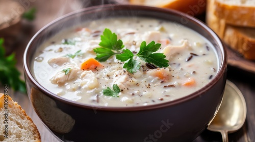 A comforting bowl of creamy chicken and wild rice soup garnished with chopped parsley and cracked black pepper, Chicken and wild rice soup served in a ceramic bowl with steam rising delicately