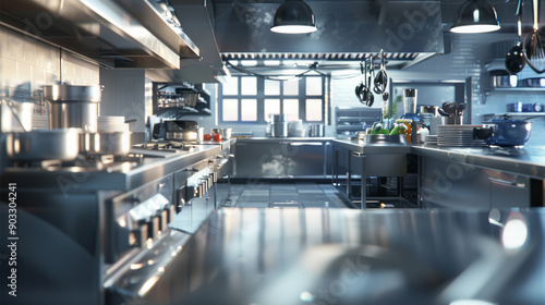 a commercial kitchen interior in a restaurant with stainless steel appliances and food processing station, Hot and Cold foods, Pastry and Preparation Station, Sauce and baking preparation unit