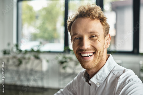 A committed businessman with red hair is diligently working on a project in a contemporary office environment.