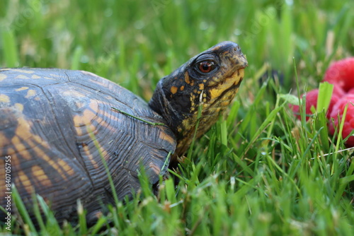 A common box turtle pausing near raspberries