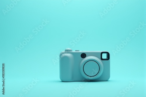 A compact digital camera with minimalist buttons placed on a pastel azure background