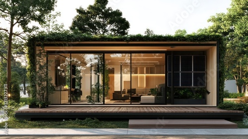 A compact eco-friendly home layout with space-saving furniture and renewable energy solutions