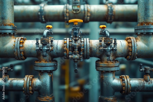 A complex arrangement of metal pipes and valves showcases the industrial infrastructure in a factory. Rust and wear highlight years of use, emphasizing a rugged operational environment