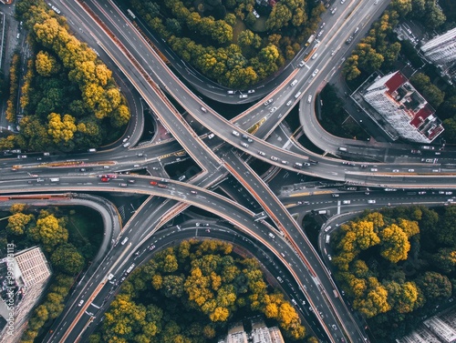 A complex highway intersection from an aerial view, showing multiple roads crossing over each other