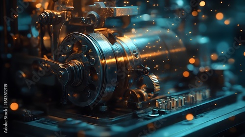 A complex machine with intricate gears and metallic components is illuminated by bokeh lights in a dark environment, showcasing industrial design and enginee.