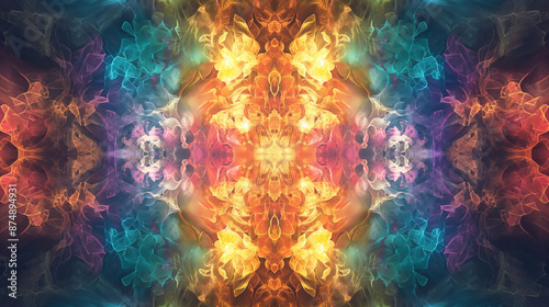 A complex mandala with bright colors and symmetrical patterns, radiating energy, left third copy space