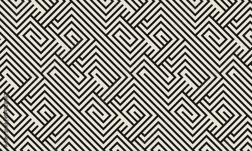 A complex, seamless geometric pattern featuring bold, interlocking black lines forming intricate, maze-like shapes