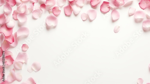A composition of flowers. Rose flower petals on white background. Valentine's Day, Mother's Day concept. Flat lay, top view, copy spac