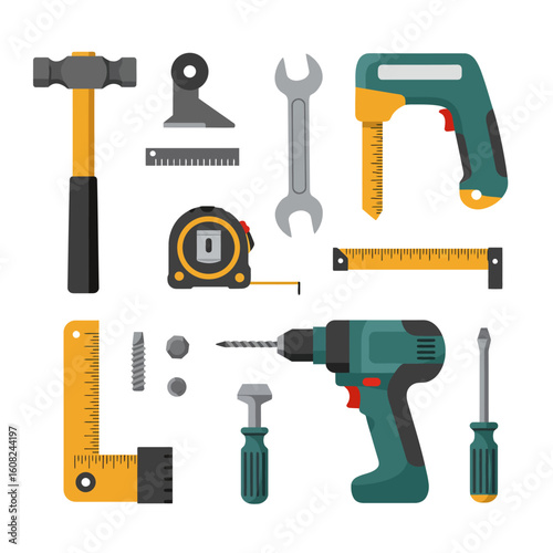 A comprehensive collection of essential hand tools and power tools for construction, repair, and home improvement projects, isolated on a clean white background.