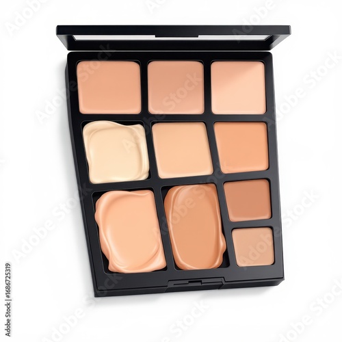 A comprehensive foundation palette showcases a variety of skin tones, from light to deep, presented in a sleek black casing.