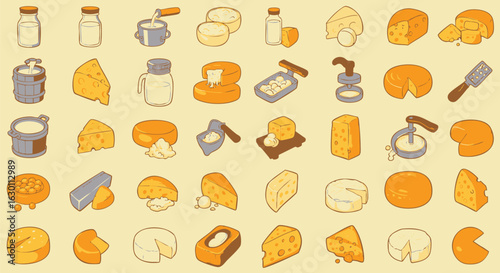 A comprehensive icon set of various cheese types and dairy products. Vector illustrations for food, farming, and gastronomy concepts.