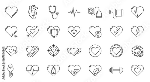A comprehensive set of thin line icons for cardiology and healthcare, including symbols for medical diagnostics, heart wellness, and romantic concepts