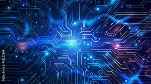 A computer chip with a blue background and orange and yellow lines