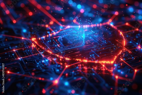 A computer chip with red and blue lights