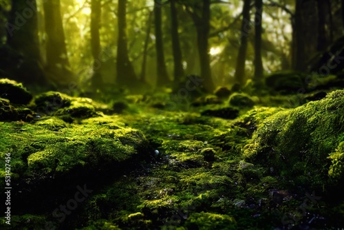 A computer generated illustration of lush green moss on a forest floor with rocks and trees. A.I. generated art.