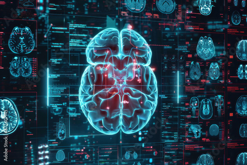 A computer generated image of a brain with a red and blue color scheme. The image is a representation of the brain and its various parts