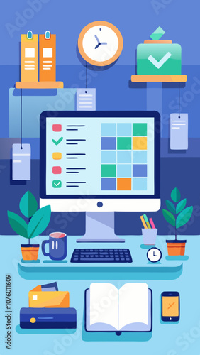 A computer monitor sits on a desk with a clock, a book, a cup, a keyboard