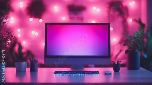 A computer monitor sits on a desk with a purple background. The monitor is turned off and the screen is blank. The desk is cluttered with various items, including a keyboard, mouse