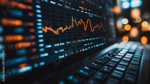 A computer screen shows a graph of stock prices. The graph is orange and black, with the orange lines representing the stock prices. Scene is serious and focused