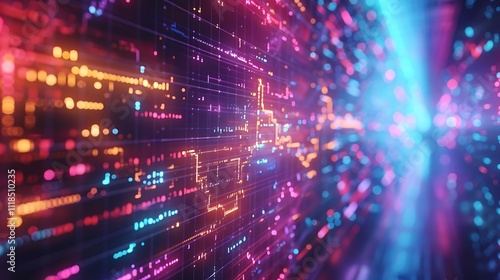 A computer screen with colorful, glowing digital displays and data visualizations.