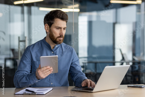 A concentrated and serious young man is sitting at a desk in the office, holding a tablet and working on a laptop