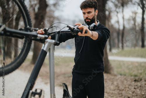 A concentrated businessman pauses in a tranquil park, bike lifted, headphones around his neck, reflecting on his workout.