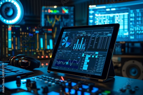 a concept art for a futuristic data analyst's workspace, a tablet displaying interactive and complex data