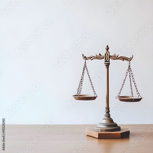 A concept image depicting a pair of scales of justice placed on a table with a white background, representing balance and fairness in law practices