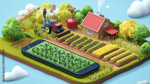 A concept of smart farming or agriculture, featuring a graphic of a mobile phone displaying an agriculture technology application, set against a farming environment. The mobile screen could show data