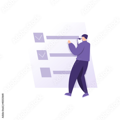 a concept of survey, voting, opinion gathering. illustration of a man giving a check on the questionnaire form or question form. resource persons and research papers. flat style. design elements