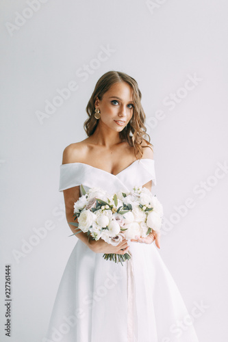A concept wedding, contemporary European bride. Bouquet of flowers, fees in the interior Studio. Ideas for a minimalist wedding, white color