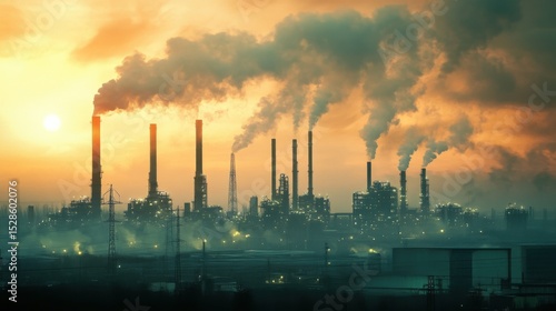 A conceptual image showing coal plants, oil refineries, and power stations with pollution clouds