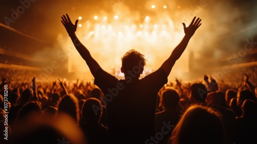 A concert crowd, illuminated by vibrant lights, raises hands in exuberant excitement as a performer captivates the audience with a dazzling live performance.