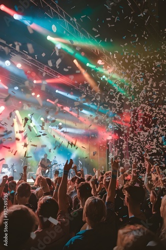 A concert crowd with colorful stage lights and confetti. The crowd is raising their hands and singing along to the music.